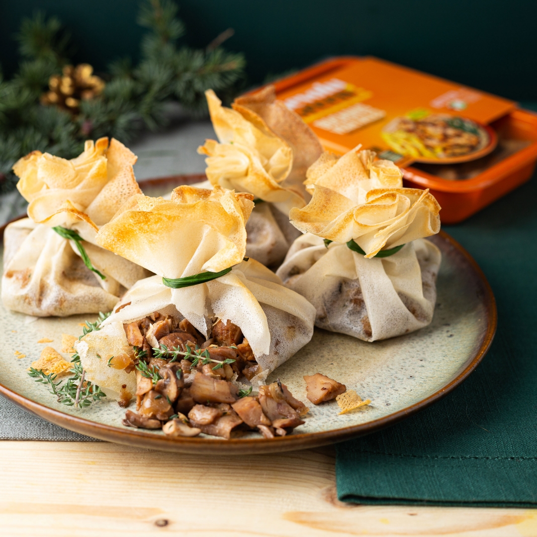 ¿Qué te parecen estos saquitos rellenos de bocados vegetales, setas y nueces?
